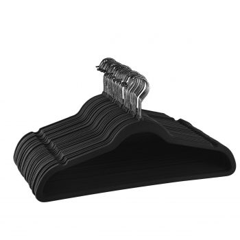 The Elama Home black flocked velvet hangers are durable and sturdy, designed to hold large and heavy pieces of clothing. It's